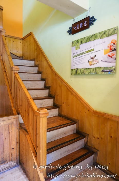 而從Buffet旁前往化妝室和二樓用餐區的木樓梯,可以從吉凡尼的花園店內裝潢中體會到,店內主要採用的是鄉村風的裝潢,令人感覺起來很放鬆。